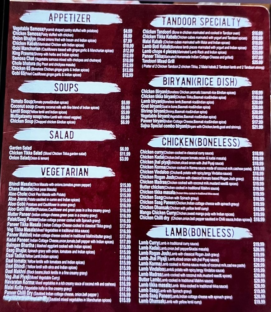 Customer reviews rave about the warm and welcoming atmosphere, attentive staff, and delicious food. Dishes like the Chicken Tikka Masala and Garlic Naan have become favorites among patrons. The attention to detail in each dish, from the spices to the presentation, showcases the dedication to providing an exceptional dining experience at Sajna Indian Cuisine.Overall, this restaurant is a must-visit for those craving authentic Indian cuisine with a twist of seafood.
